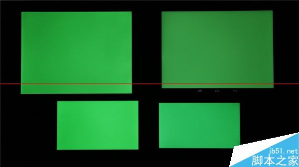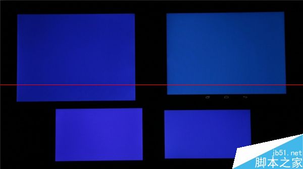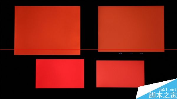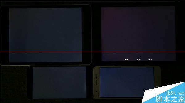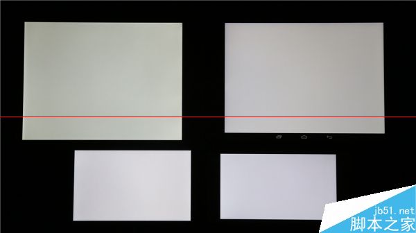 統一100%亮度顯示白色,左上角的小米平板真的是大黃屏,右上角的愛國者X86色溫表現和左下角的MX4接近,偏暖偏紅,而右下角的Xshot稍微偏冷。