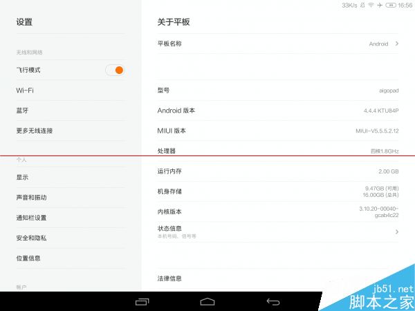 其移植的是基于安卓4.4.4的平板版MIUI V5,設置菜單為雙欄設計,通知欄有半透明毛玻璃特效,多任務界面已經是卡片式,設定鍵已經被多任務鍵代替。