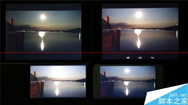 樣張表現,左上角的小米平板的大黃屏明顯偏黃,色溫上和其他幾個“格格不入”;其次是右上角的愛國者X86,雖然程度較輕,但同樣是偏黃;右下角的Xshot則是黑色壓不下去,對比度偏低(落日樣張)。