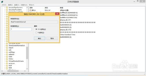 第三步、在TimeZoneInformation這個文件夾新建DWORD值(32位),重命名為"RealTimeIsUniversal"值設為1,設置完后.關閉注冊表編輯器.重新啟動平板.時間問題既可解決