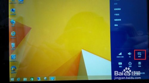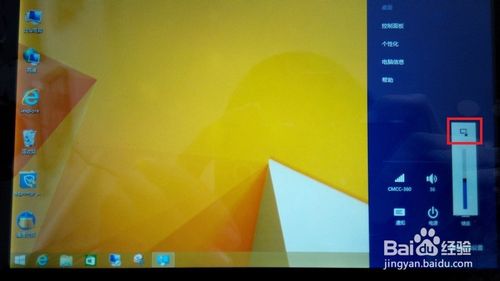 4、用手指在屏幕右側(cè)邊界輕輕向內(nèi)滑動,會彈出一列藍底的設(shè)置選項,在右下角找到“屏幕”圖標;