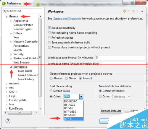 5、另外,如果讀者有用eclipse開發工具,要想將所有的項目java文件編碼設置為UTF-8,就這樣做,在菜單欄依次點擊Windows→Preferences→General→Workspance即可找到,如圖所示,建議在新建項目時去設置,不要在已有項目下設置,否則會出現亂碼。eclipse在重新創建工程文件時的默認設置就是GBK編碼,筆者對此深感無奈,需要經常去設置。