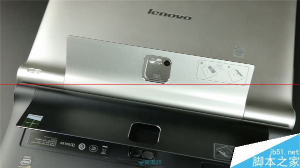 背面正中是內(nèi)凹的品牌拉絲logo,底下正中位置是JBL的低音炮和攝像頭,右側(cè)是英特爾處理器特有的貼紙和開(kāi)支支架的說(shuō)明。