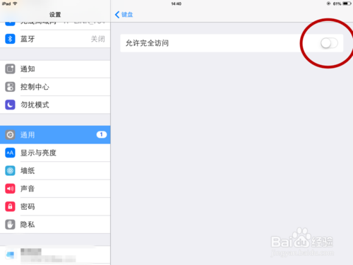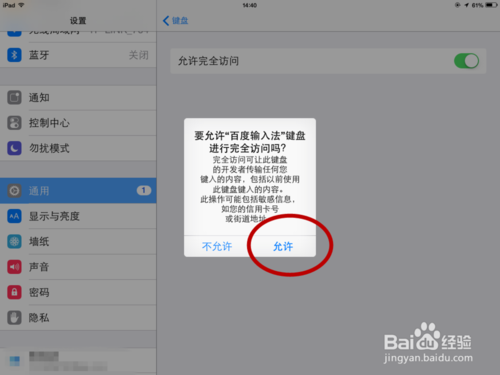 之后會看到在原來鍵盤的界面出現一個百度輸入法,點擊后吧“允許完全訪問”開啟。