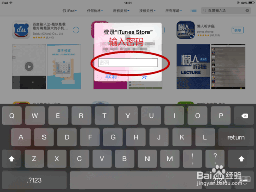 搜索出來后點擊軟件那的獲取,再點安裝,一會就會出來iTunes store,輸入密碼。出來后便會看到百度輸入法的圖標正在下載安裝。