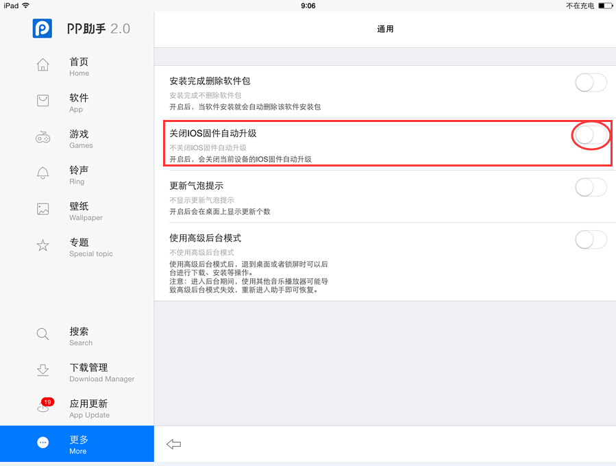 大多數果粉在iphone或者ipad越獄后想直接在設備上進行系統升級都會遇到一直顯示正在檢查更新界面不動,這是因為越獄后自動屏蔽更新了,如果裝了pp助手先在pp助手設置里面將關閉ios固件自動升級選項關閉再去試一下。