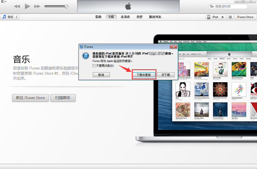 2.如果ipad或者iphone不是最新的系統在連接電腦后會有提示現有新軟件版本可供更新,點下載并更新即可。更新過程會有點慢,需要耐心等待。