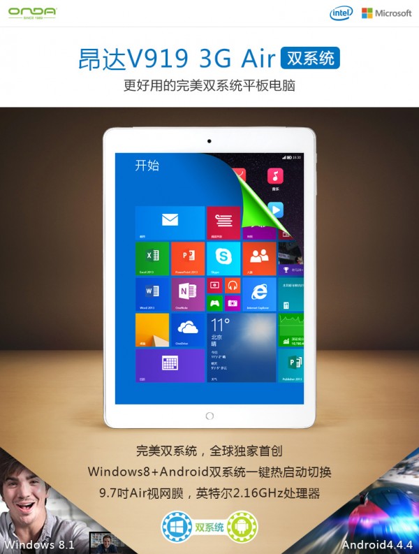 競爭日益激烈的平板市場是擺在廠商眼前的難題,考量如何做出性價比更高的產(chǎn)品的同時Windows和Android的雙系統(tǒng)支持儼然成為當下的重要突破口。在今年CES大展前夕,國內(nèi)廠商昂達(Onda)推出了型號為“V919 3G Air”的新款平板,采用英特爾BayTrail-T Z3736F四核64位處理器,分辨率為2048*1536的9.7英寸屏幕,64GB版本售價為1199元。
