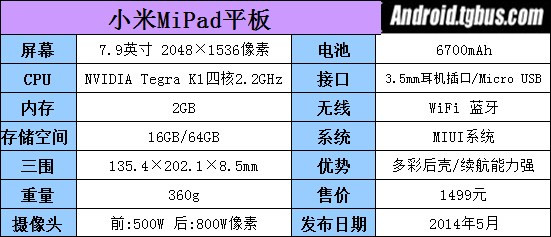 配置方面,小米平板采用一塊7.9英寸2048×1536分辨率顯示屏,搭載NVIDIA四核2.2GHz的Tegra K1處理器,內置2GB內存和16/64GB機身存儲空間,最高支持128GB micro SD卡擴展,提供一顆500萬像素前置攝像頭和一顆800萬像素索尼背照式后置攝像頭,電池容量6700mAh。