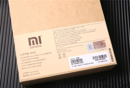小米平板和小米其他系列的產品外包裝一致,采用了牛皮紙配色的紙盒。一塵不變的設計,這也說明了小米一直以來的產品風格。