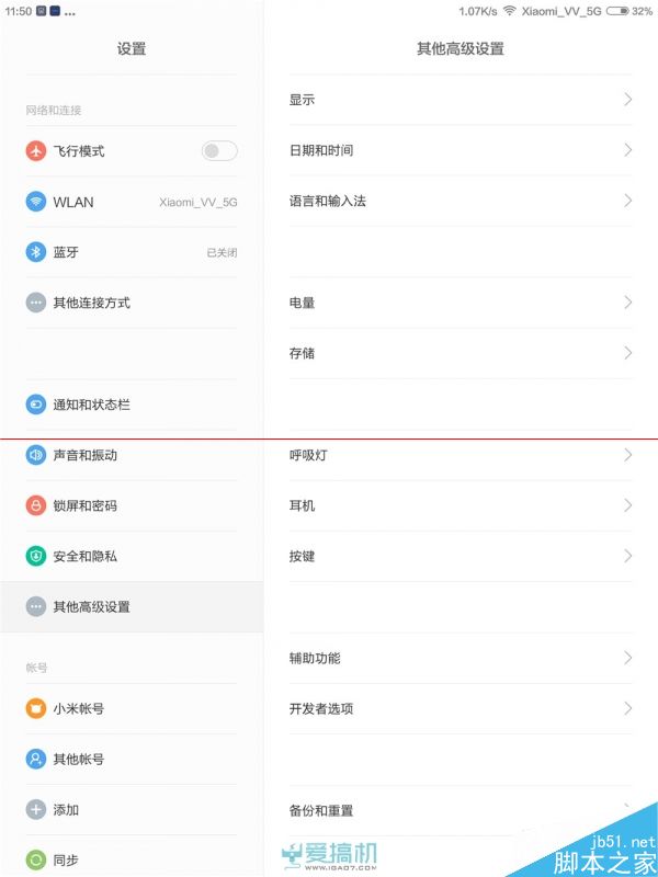 左側的列表和手機版的 MIUI6 幾乎一樣。MIUI6 對設置項重排,將顯示、電量、開發者選項等眾多高級設置放到了第二級的菜單。普通用戶可能會覺清爽許多,但geek或高級用戶可能會覺得有點不便。
