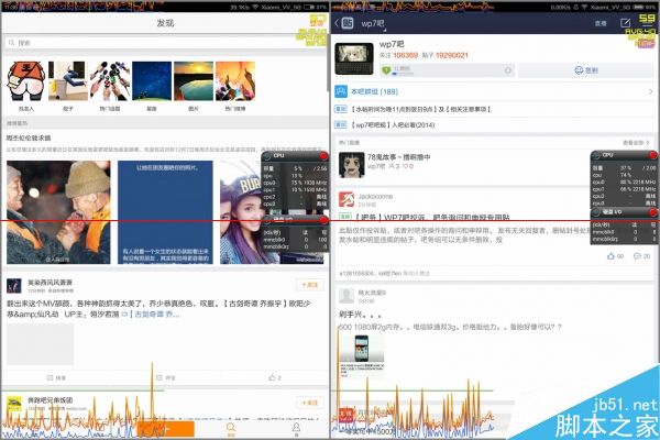 而面對貼吧、微博這些第三方的性能毒瘤,靠Tegra K1帶來的狂暴性能,基本是2個核心在跑,照樣接近滿幀,曲線很少過綠線。