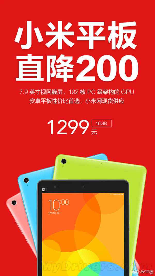現在,小米正式公布了所謂的好消息,小米平板真的降價了,但沒有999那么狠。按照小米的說法,原價1499元的小米平板16GB版的將降價至1299元,降幅為200元。至于1699元的64GB版售價應該是不會下調,至少官網還顯示為1699元。