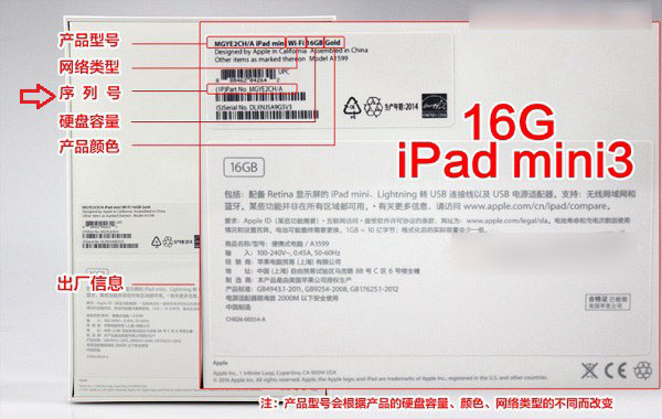 如果您是在蘋果官方途徑或者正規店面購買的iPad mini 3,那么可以直接從iPad mini 3包裝盒背面的銘牌中找到,如下圖所示。