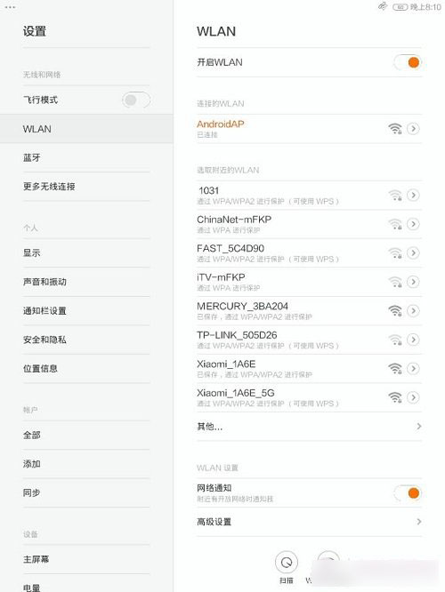 3,使用小米平板,搜索WIFI“AadroidAP”輸入密碼就可以連接無線,使用手機網絡進行定位,如圖所示:
