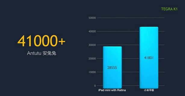 性能方面,小米平板電腦搭載了2.2Ghz主頻NVIDIA Tegra K1四核處理器,運行2GB內存,安兔兔跑分過四萬,而iPad mini2平板電腦采用最新的是蘋果A7雙核處理器,運行1G內存,以下我們分別通過兩者的安兔兔跑分以及3D圖形性能跑分軟件,來測試下兩者的跑分性能。