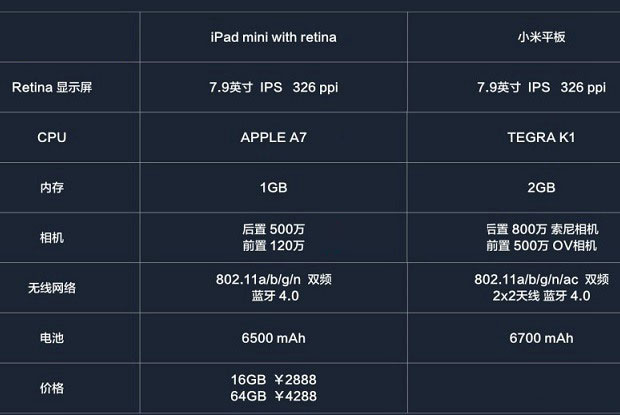 對比之前,我們先來簡單,看看小米平板和iPad mini2參數(shù)對比。