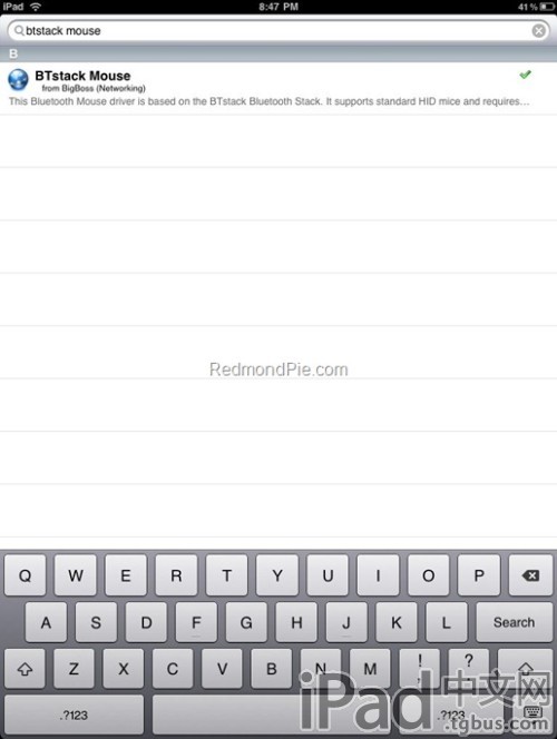 首先要確定你的iPad已經越獄,進入Cydia搜索BTstack Mouse這個軟件,然后點擊安裝這個軟件。