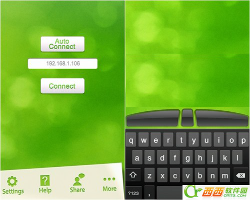 在上圖中的文本框里面輸入上面電腦端彈出的ip地址,然后選擇下面的【Connect】就可以連接上電腦了,連接成功后如上圖右邊,就是模擬的觸控板跟鍵盤。很簡單吧!