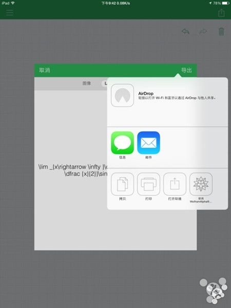 來自 MyScript 公司的 MathPad 軟件則是一款手寫的輸入軟件,被稱為發電機 LaTex(相信也會有所耳聞吧這個軟件)的手稿,可以通過手寫直接寫出復雜的數學算式,并支持導出為 LaTex 以及 MathML 格式的代碼。最重要的是,支持跨軟件使用 WolframAlpha 運算寫出來的式子。這樣以來,就可以像在草稿紙上一樣寫出需要計算的式子,然后直接導入到 WolframAlpha 中就可以計算了。PS:若需使用導出至 WolframAlpha 功能需內購。