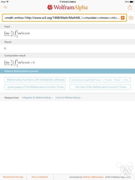 相信理工科的童鞋們都知道 Mathematica 這款軟件,WolframAlpha 可以說就是移動版的 Mathematica(來自同一公司),并且不局限于計算,可以說是 Wolfram 公司的維基百科,天文地理藝術人文無所不知。但是 WolframAlpha 的輸入十分繁瑣,特別是稍微復雜一點的運算式,各種運算會包含一層一層又一層的括號,還得在鍵盤里到處尋找你所需要的符號。用過 matlab 的就知道要把帶很多分號括號積分乘開方的式子變成一行代碼是比較痛苦的,要在 iPad 上寫出來就更加麻煩了。PS:需聯網才能使用。