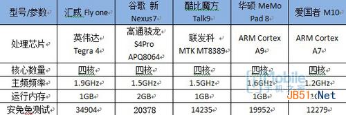 在同價位產品中,以谷歌新Nexus7為首,輔以酷比魔方、愛國者等等國內知名平板產品進行對比,通過安兔兔的得分得知,匯威Flyone憑借近35000分力壓群雄,無疑是性能最為強大的。而在對比測試的平板產品中,所采用的芯片包含高通驍龍、聯發科、ARMA9和A7等主流處理器,最終的結果還是很有代表性的,英偉達Tegra 4果然名不虛傳。