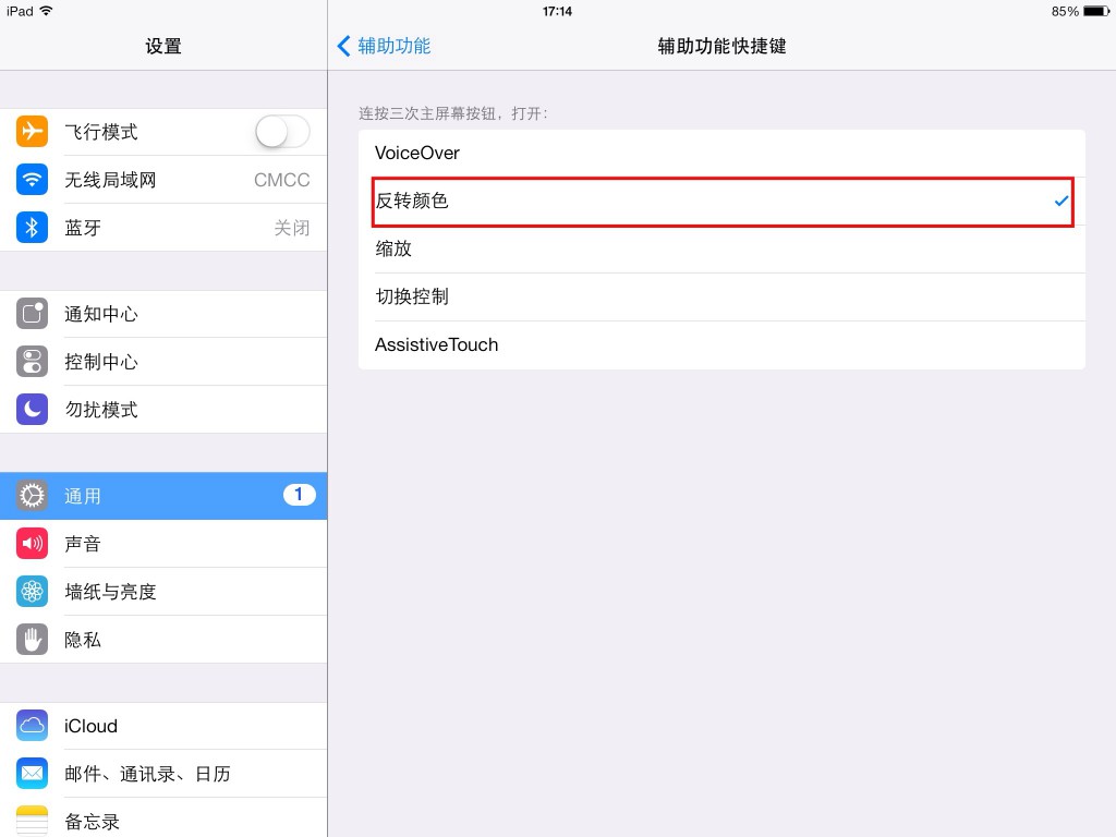 另外,我們還可以設(shè)置“反轉(zhuǎn)顏色”的快捷鍵。操作方式也很簡單:進入【設(shè)置】——【通用】——【輔助功能】——【輔助功能快捷鍵】,選定“反轉(zhuǎn)顏色”即可。設(shè)置完畢后,在任何界面里,只需連續(xù)三次點擊home鍵,即可快速進入夜間模式。