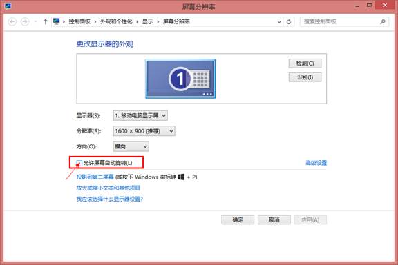 打開屏幕分辨率,里面有允許屏幕自動(dòng)旋轉(zhuǎn),勾選屏幕自動(dòng)旋轉(zhuǎn)開啟,不勾選是關(guān)閉的,如圖: