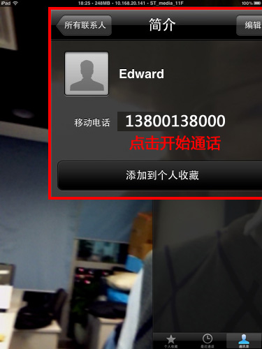 7.點擊通訊錄中的電話號碼或者郵件地址,開始呼叫對方。
