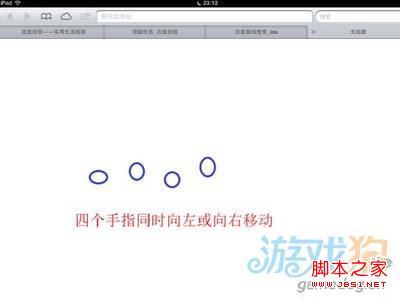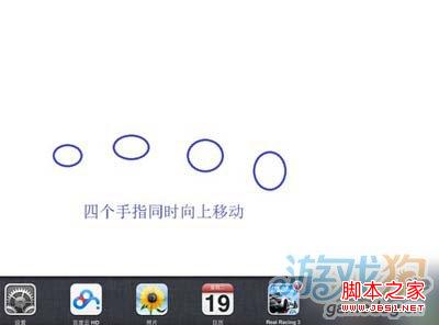 用四個手指在 iPad 的屏幕上同時向上移動,即可打開 iPad 的多任務管理。這個手勢的功能等同于我們連續按二次“HOME主屏鍵”,如圖所示