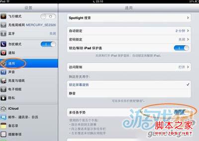 首先打開 iPad 上的設置,點擊左邊的“通用”,然后在右邊打開“多任務手勢”,如圖所示