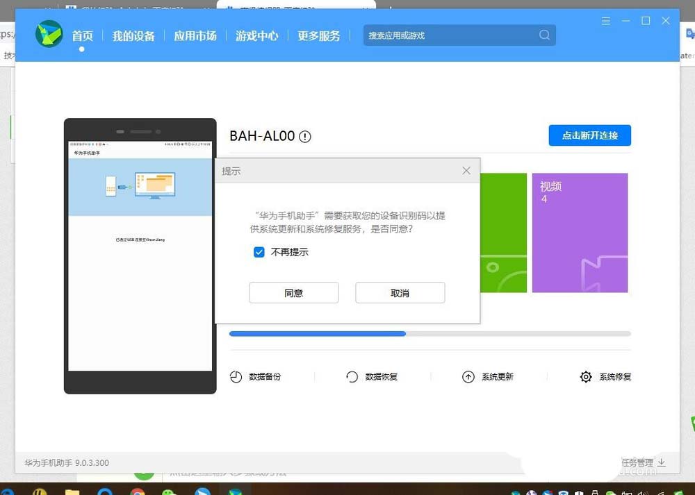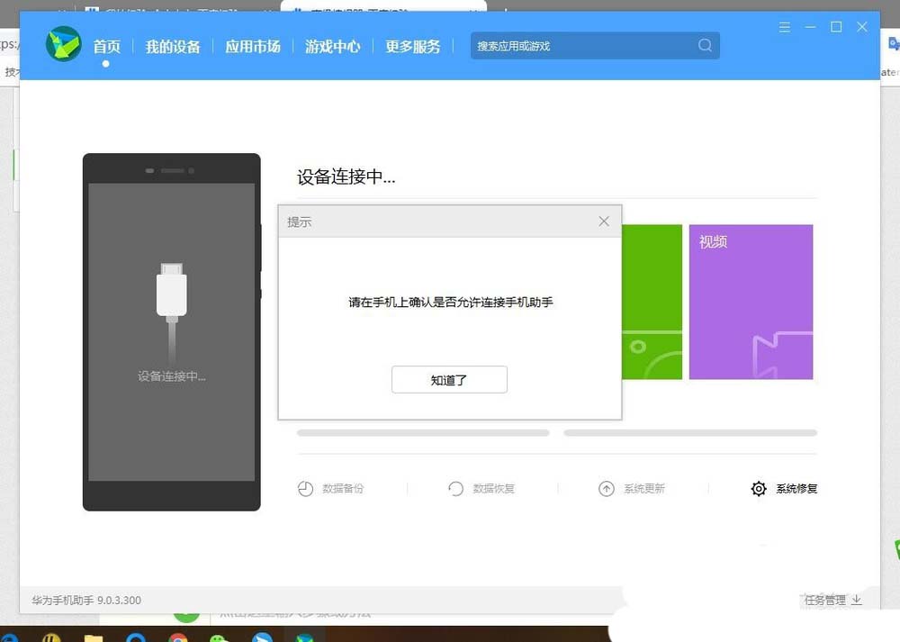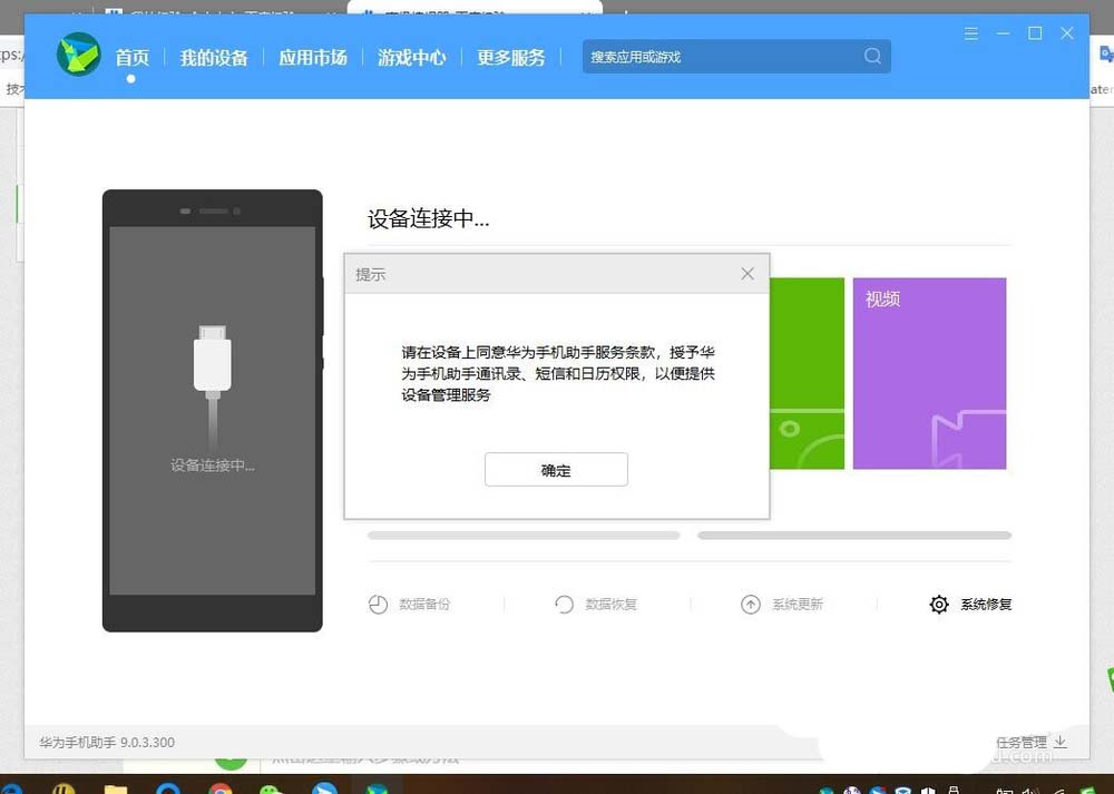 5、安裝完成后,設(shè)備顯示正在連接中,同時電腦端會提示手機助手的服務(wù)條款,需要在平板端進行確認同意。兩邊客戶端都同意后,表示安裝成功。