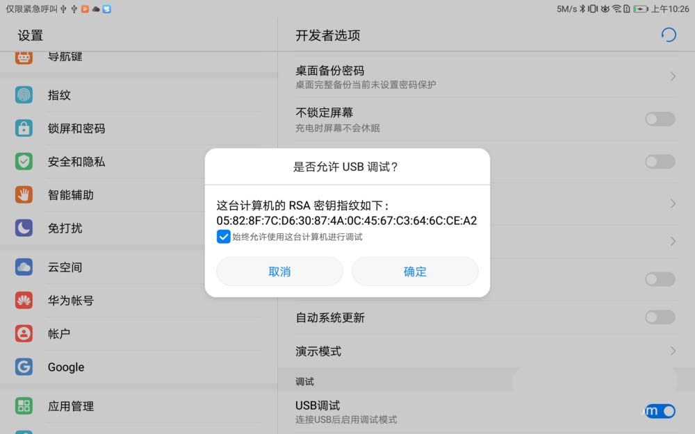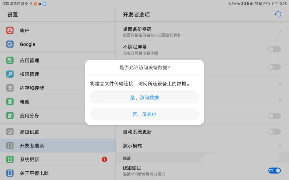 注:請先在平板”設(shè)置“--”開發(fā)者選項“中,打開USB調(diào)試選項。