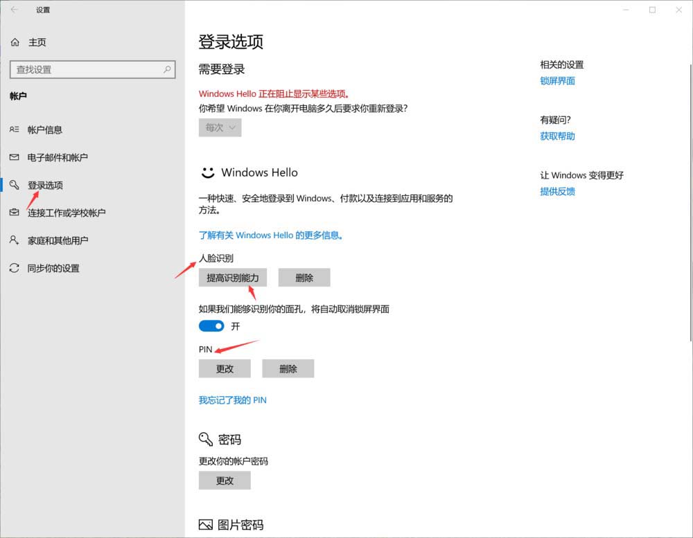 2、選擇賬戶,點進去,再看登陸選項,右邊,人臉識別,點擊,如果是首次設置,會提示輸入當前密碼,或者簡單PIN碼。