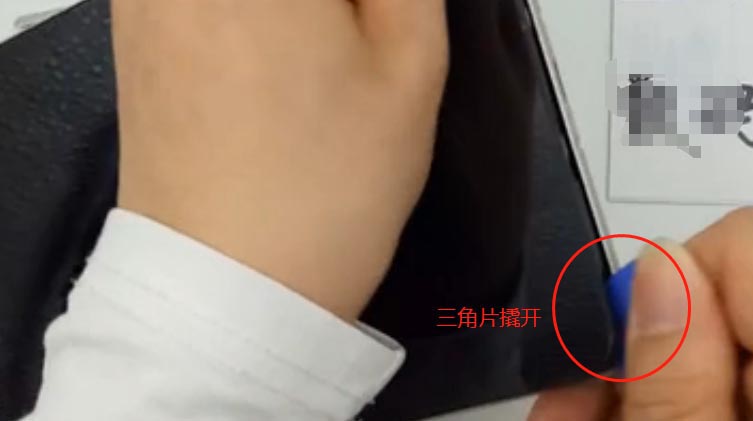 3、拆完之后,用吸盤吸住屏幕下方底部,然后再用撬棒頂住,用三角塑料棒,進行慢慢撬開,如圖所示: