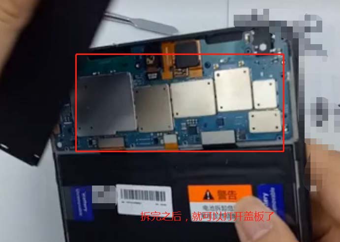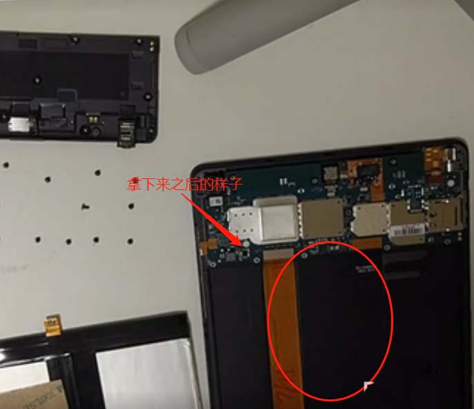 7、然后撥掉上方的電池排線接口,再找到電池背后的兩個標簽,撕開,方便拉出電池,如圖所示: