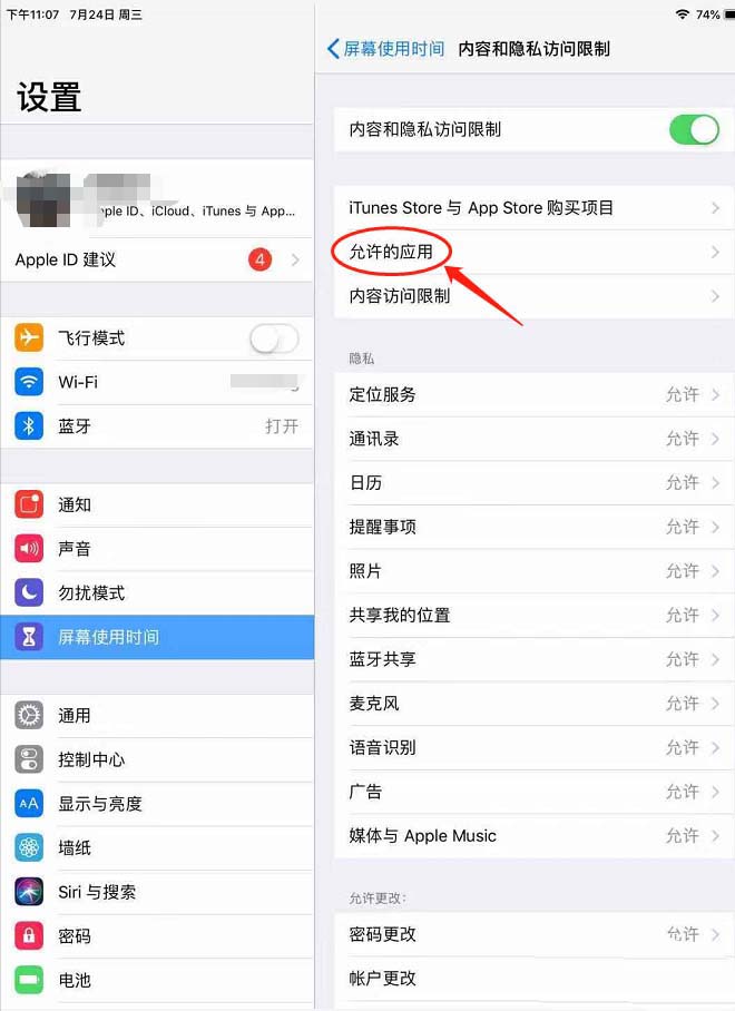 3、如果要隱藏iPad自帶的應(yīng)用,點(diǎn)擊“允許的應(yīng)用”,