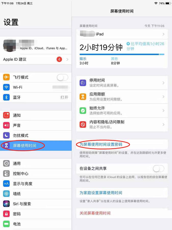 1、打開iPad的設(shè)置,點(diǎn)擊“屏幕使用時(shí)間”-“為屏幕使用時(shí)間設(shè)置密碼”,設(shè)置好密碼以后,點(diǎn)擊“內(nèi)容和隱私訪問限制”;