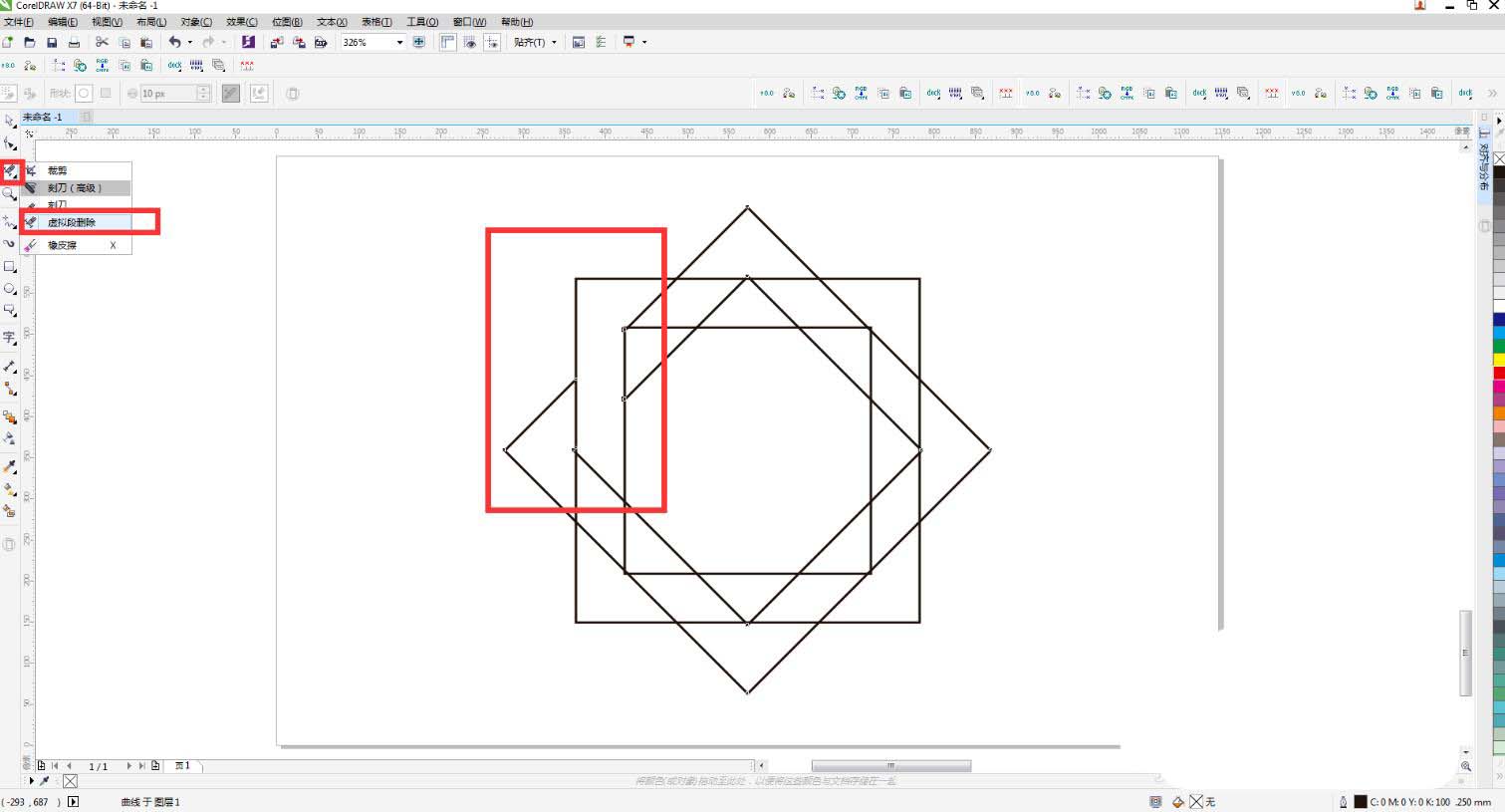 2、選中矩形框按“+”鍵復制,點擊旋轉45度,點擊虛擬段刪除工具刪除矩形中重疊的線條。