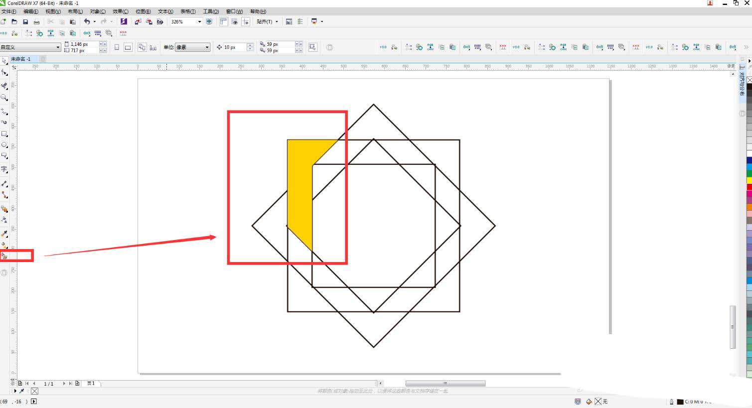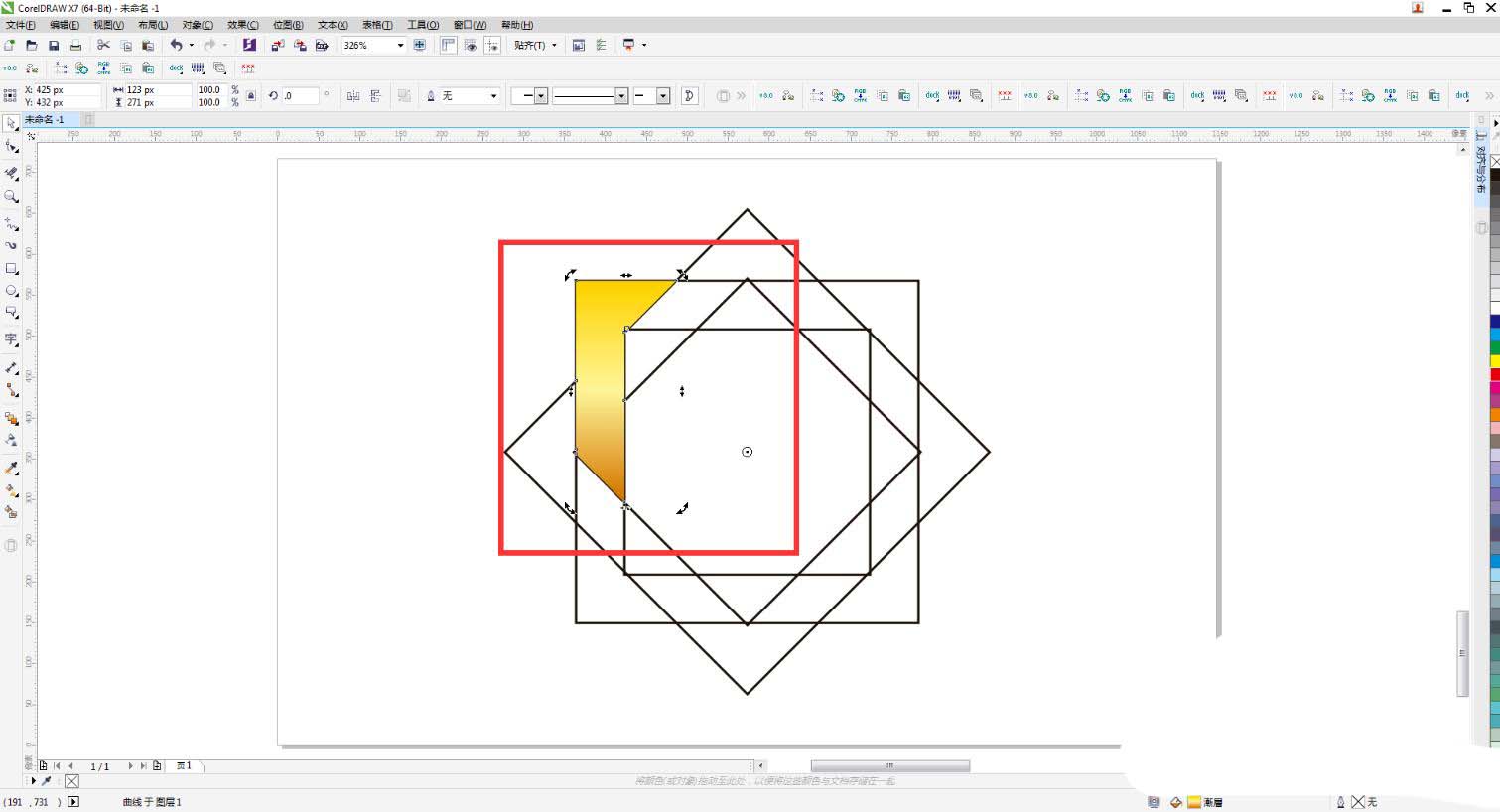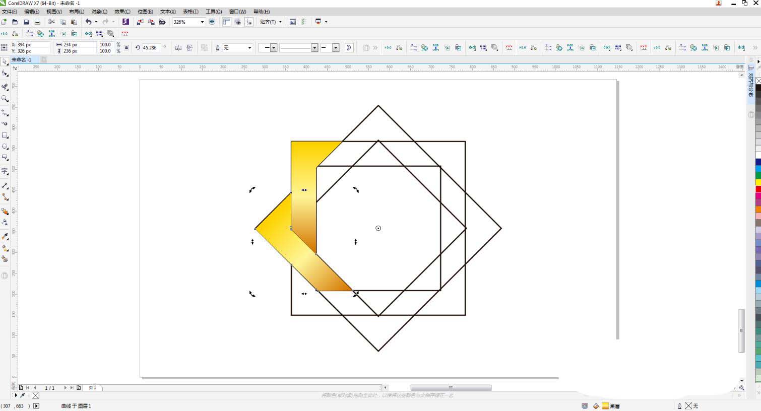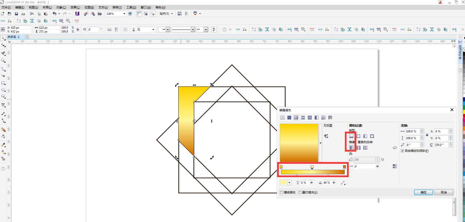 3、點擊智能填充工具,給多邊形填充顏色,然后按F11填充漸變色。把旋轉中心點拖到矩形框的中心。