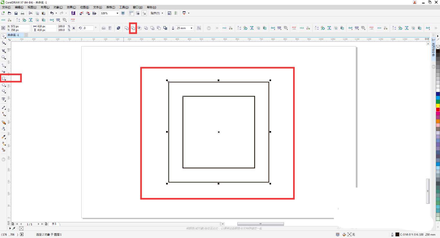 1、打開cdr軟件新建文檔,點擊矩形工具繪制兩個大小不一的同心矩形并修剪掉小的矩形。