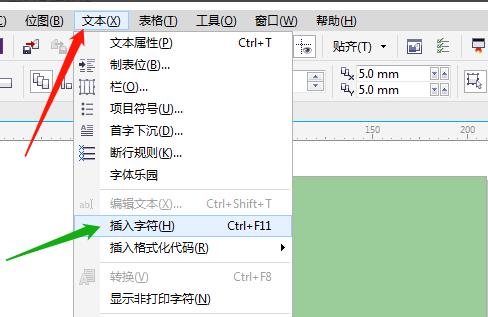 2、單擊文本菜單中插入字符,在調色板處位置,有時隱藏單擊插入字符。