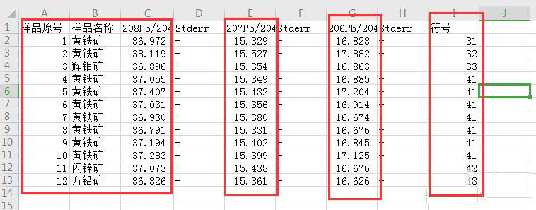 2、準備鉛同位素數據,必須按照一定格式去準備,見下圖,通過excel或WPS進行編輯好后,另存為txt文件格式即可。符號列可以輸入31、32、33、……310,41、42、……410,51、52、……510,目前定義的符號比較少。Stderr列可以輸入任意值,但不能空白。第一列編號不能為純數字,否則可能出錯,最好為A1、By2等形式。