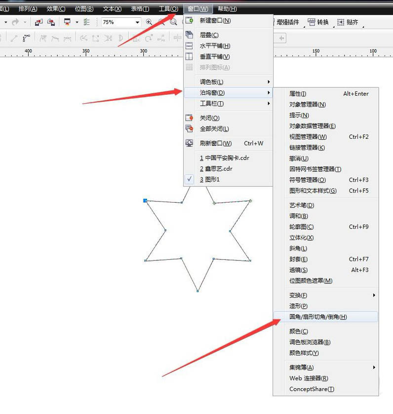 6、調出圓角面板。在窗口菜單欄中選擇泊塢窗——然后選擇扇形角圓角倒棱角,調出圓角面板