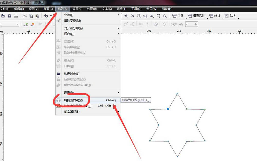 4、轉化為曲線。選擇圖形,在排列菜單欄中選擇轉化為曲線,也可以使用快捷鍵CTRL+Q