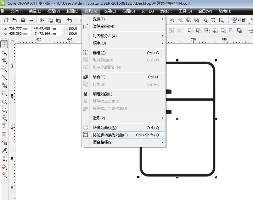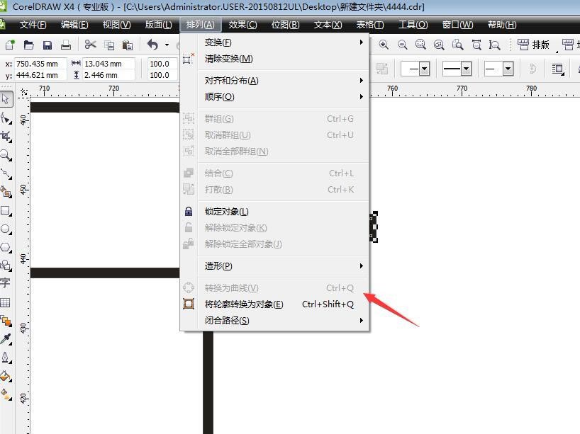 4、轉化為曲線。將這個矩形轉化為曲線,在排列菜單欄中選中轉曲,也可以使用快捷鍵CTRL+Q