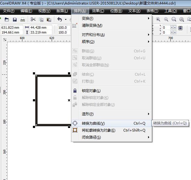 2、加粗轉(zhuǎn)曲。將繪制好的矩形選擇,在屬性欄中增加輪廓線為1.5,然后在排列菜單欄中選中轉(zhuǎn)化為曲線,快捷鍵是CTRL+Q
