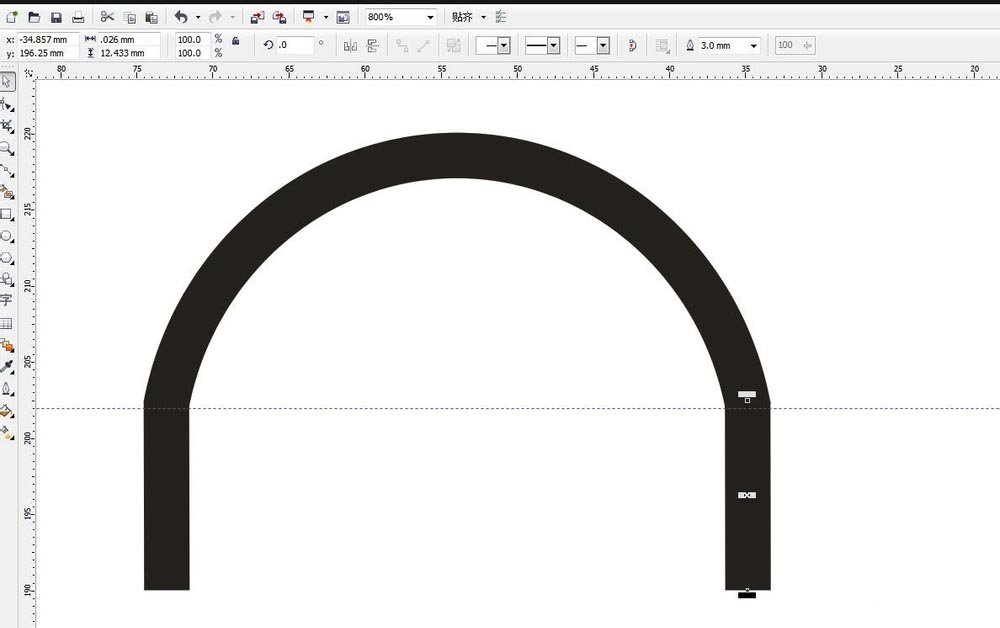 3、拉出參考線調(diào)節(jié)弧形。為了讓兩個點在一個水平線上,我們在圓形的上方拉出一個輔助線,然后調(diào)節(jié)這個弧形兩端的端頭,保持左右是對稱的狀態(tài)