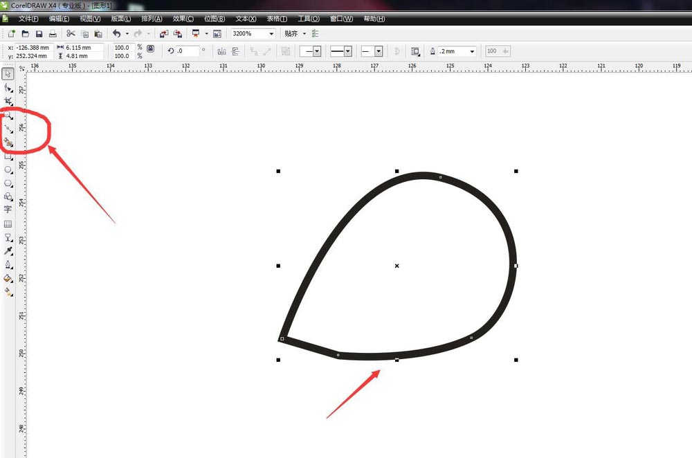 在工具欄中選擇貝塞爾工具,繪制曲線,類似花瓣的效果,如下圖所指示,一定要將圖形完全閉合,不然不能填充顏色,也開始使用屬性欄閉合曲線
