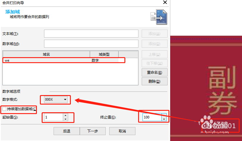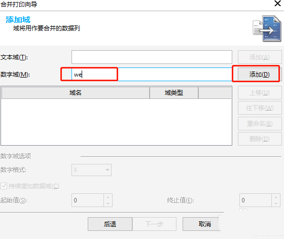4、數字域隨便寫個名字。添加。點擊添加上的we,編輯好下面的信息。下一步,完成。